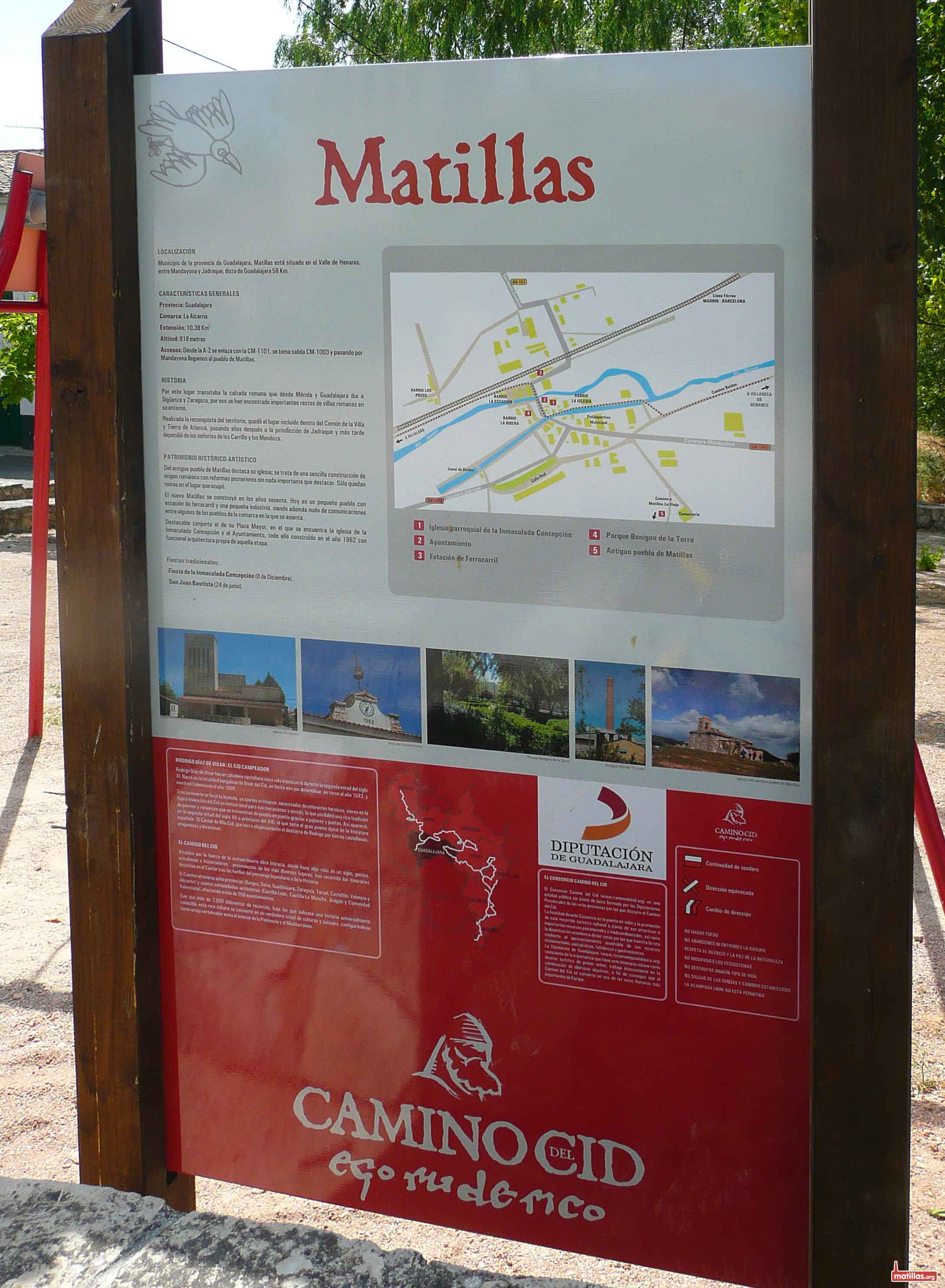 Además del poste señalizador, en el parque han colocado un panel con datos de Matillas (extensión, altitud, accesos…), además de su historia y el patrimonio histórico-artístico. De historia nos cuentan el tema de la calzada romana y poco más. En lo que respecta a patrimonio, hablan someramente de Matillas La Vieja y luego de la Plaza Mayor. Lamentablemente, ni rastro de la Fábrica de Cemento, siendo el pilar capital para el desarrollo de Matillas. Vale que es horrible y mugrienta (la fábrica), pero el patrimonio industrial es, si cabe, la mayor aportación de Matillas.